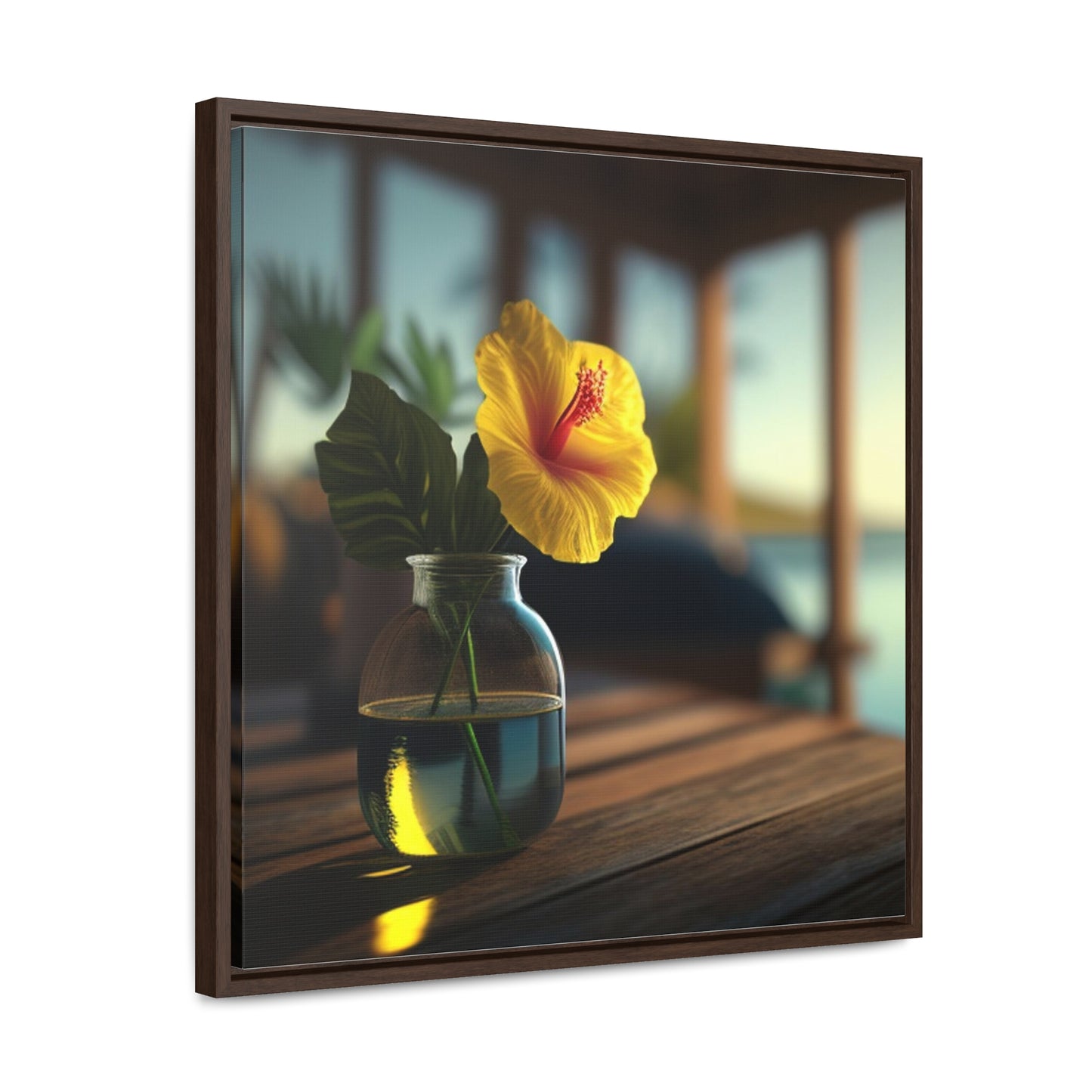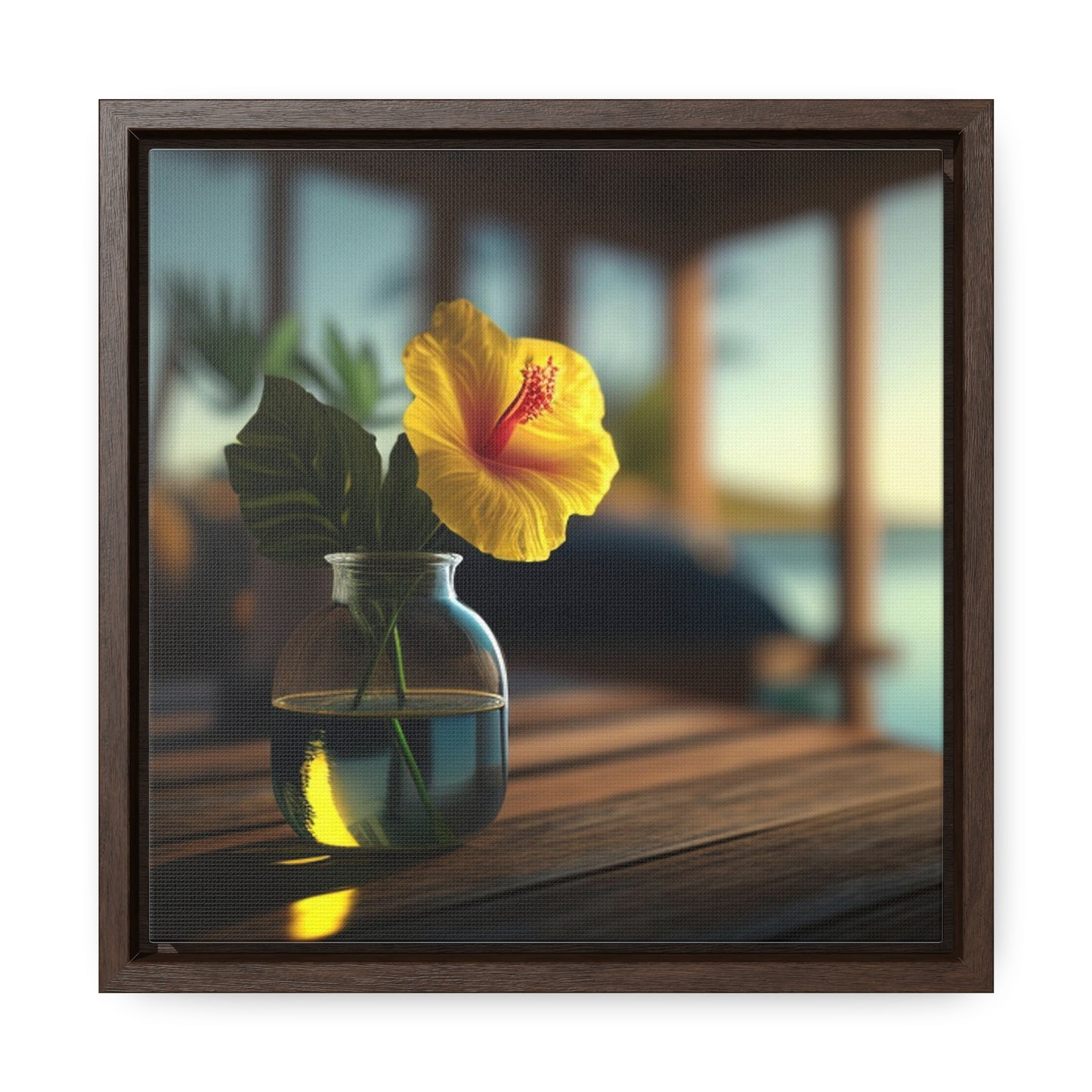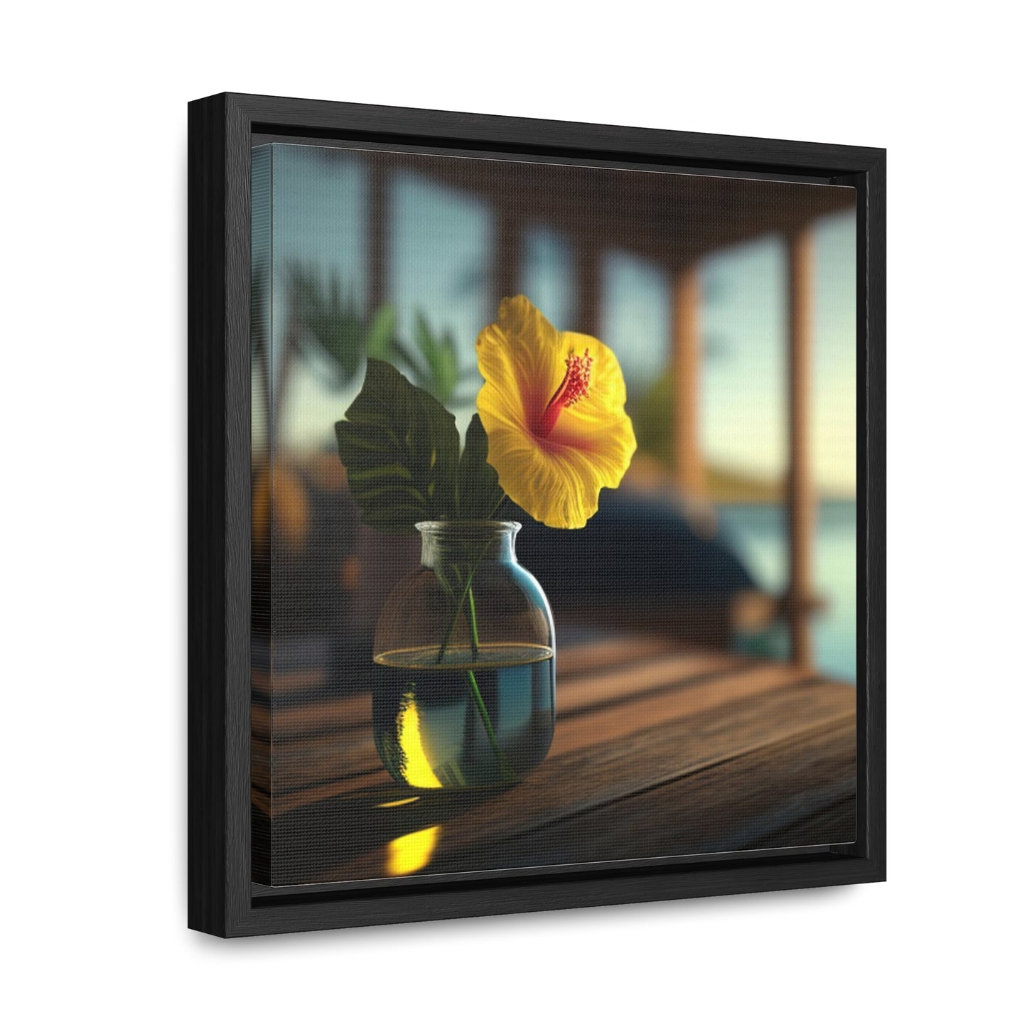 Bring a bright tropical feel into your home with our square-framed Yellow Hibiscus Wood 2 Canvas Wrap. The handcrafted wooden frame contains a vivid image that showcases beautiful blooms of yellow hibiscus flowers against a deep blue sea. This premium artwork is printed on fade-resistant canvas, and finished with a glossy protective coating. Take home this memorable piece of art to brighten your living space. #canvaswrap #squareframe #yellowhibiscus #artwork #gallerycanvas #homedecor #artlovers #handcraftedwood #beautyofflora #homedesign #fadeproof #vividimage #glossyfinish #beachvibes