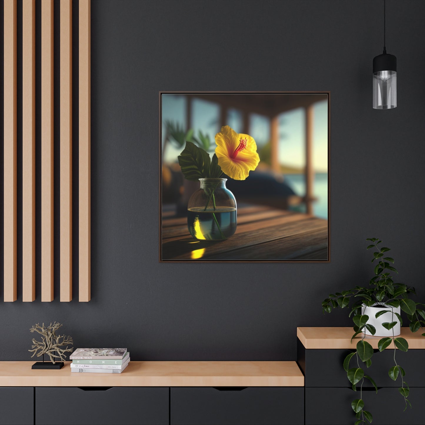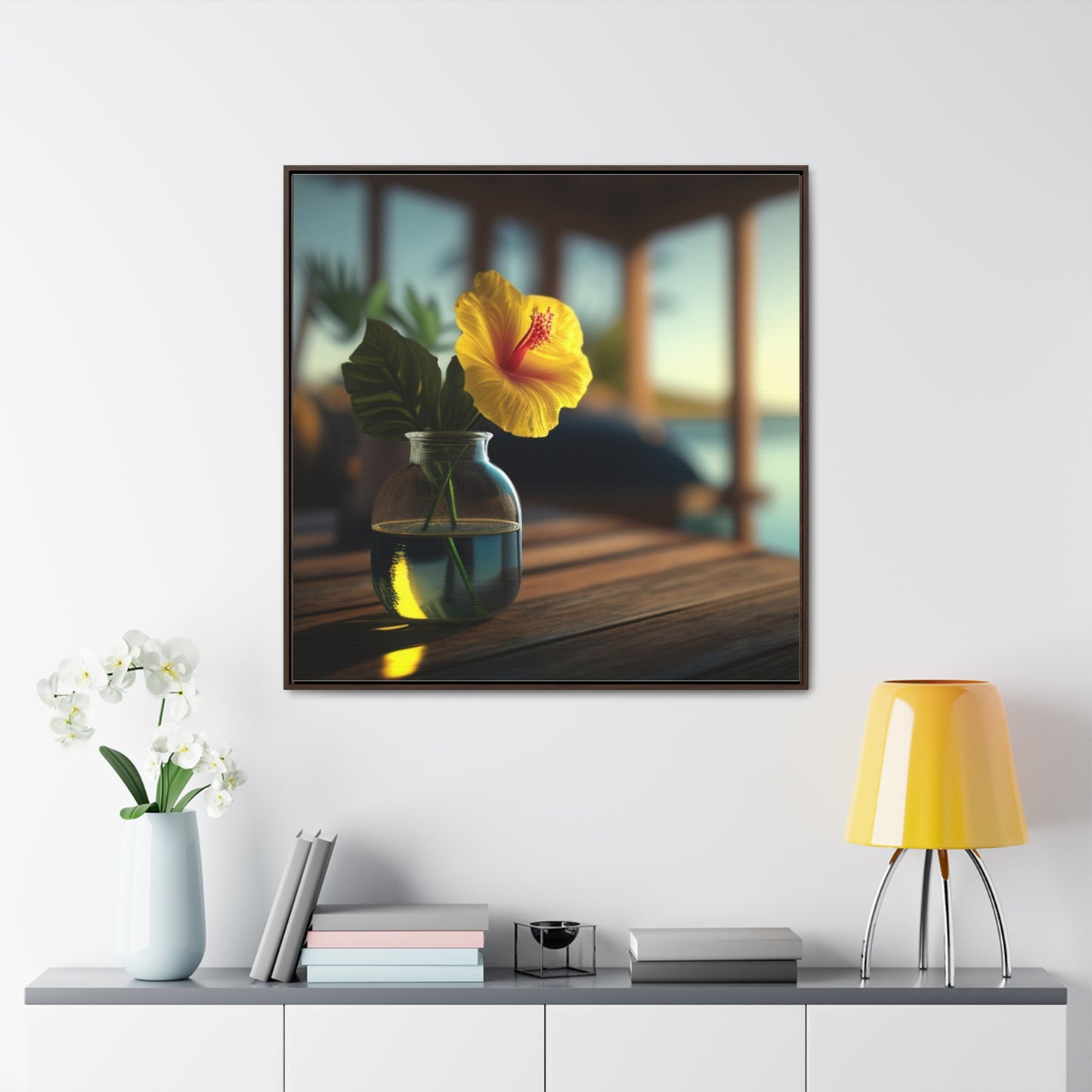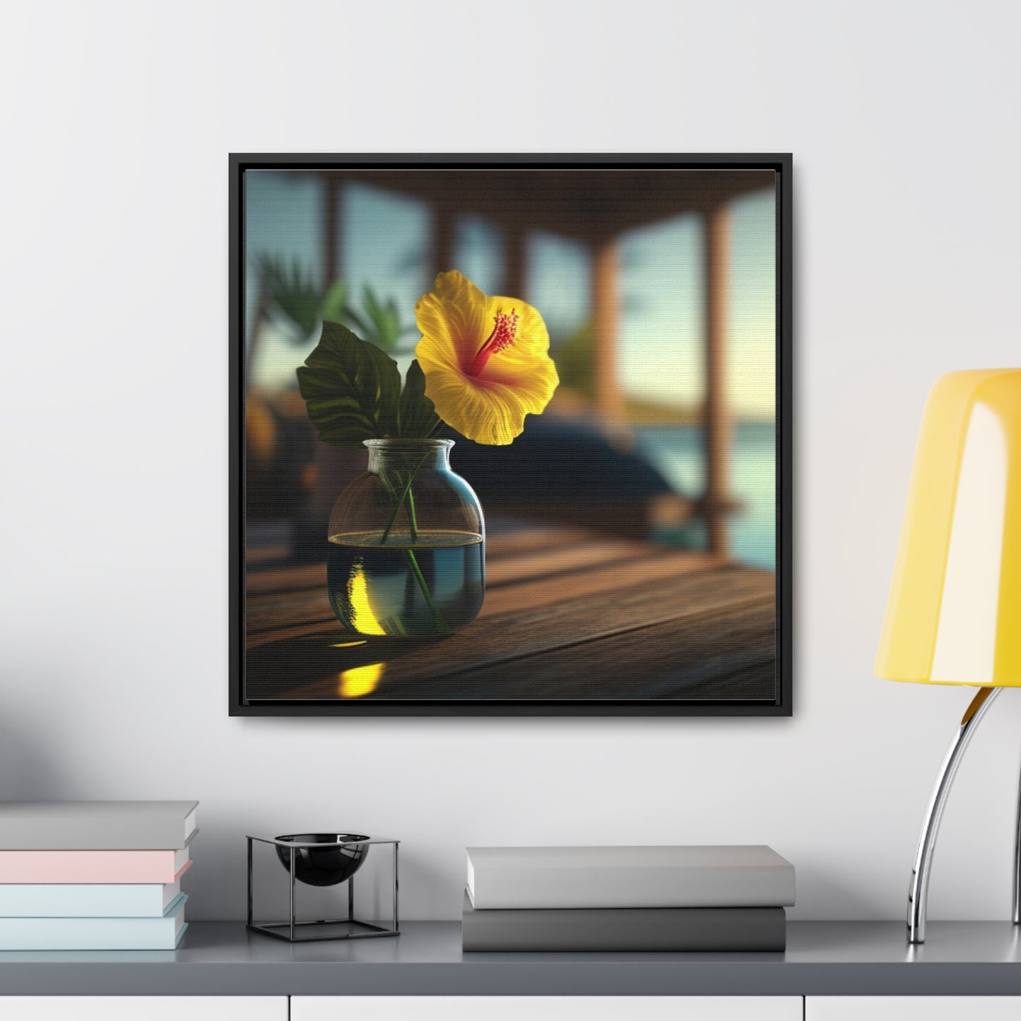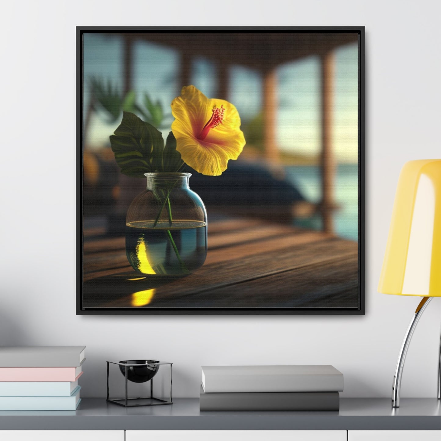 Bring a bright tropical feel into your home with our square-framed Yellow Hibiscus Wood 2 Canvas Wrap. The handcrafted wooden frame contains a vivid image that showcases beautiful blooms of yellow hibiscus flowers against a deep blue sea. This premium artwork is printed on fade-resistant canvas, and finished with a glossy protective coating. Take home this memorable piece of art to brighten your living space. #canvaswrap #squareframe #yellowhibiscus #artwork #gallerycanvas #homedecor #artlovers #handcraftedwood #beautyofflora #homedesign #fadeproof #vividimage #glossyfinish #beachvibes