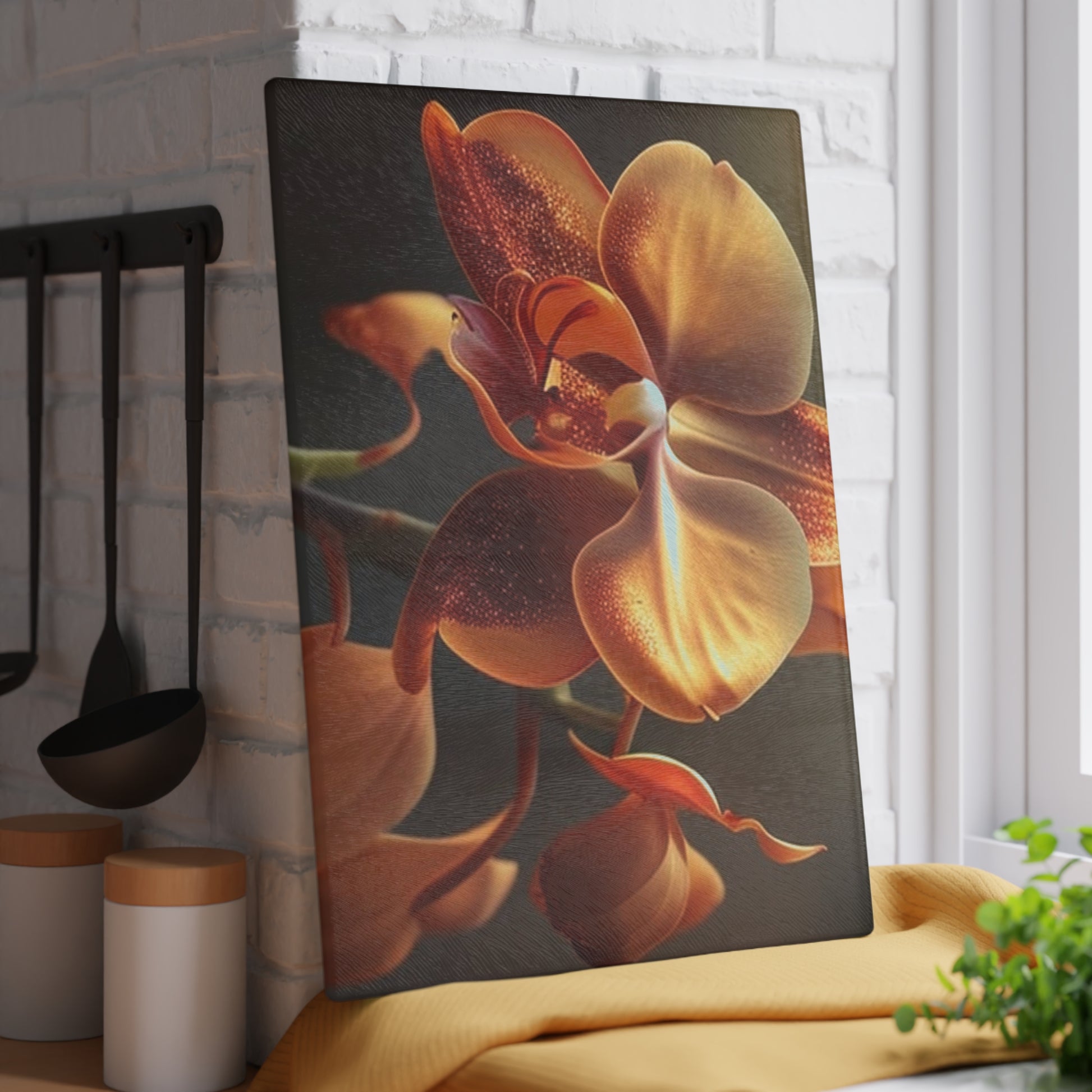 The Orange Orchid 1 Glass Cutting Board is the perfect addition to your kitchen. With its smooth, non-porous surface, you can quickly chop vegetables and fruits on top without worry of staining or odors. Cleanup is a breeze, and our scratch-resistant design ensures that it will last for many meals to come. #kitchen #cuttingboard #cooking #durable #smooth #nonporous #Scratchresistant #dishwasherSafe #décor #useful #cookingEssentials #durability