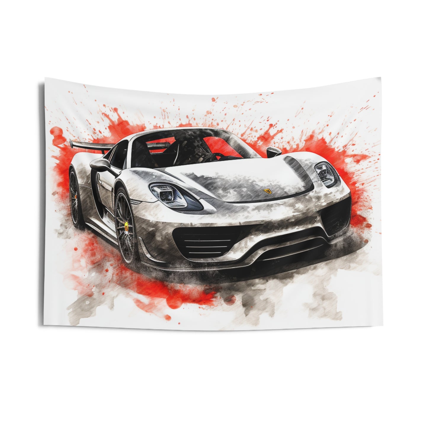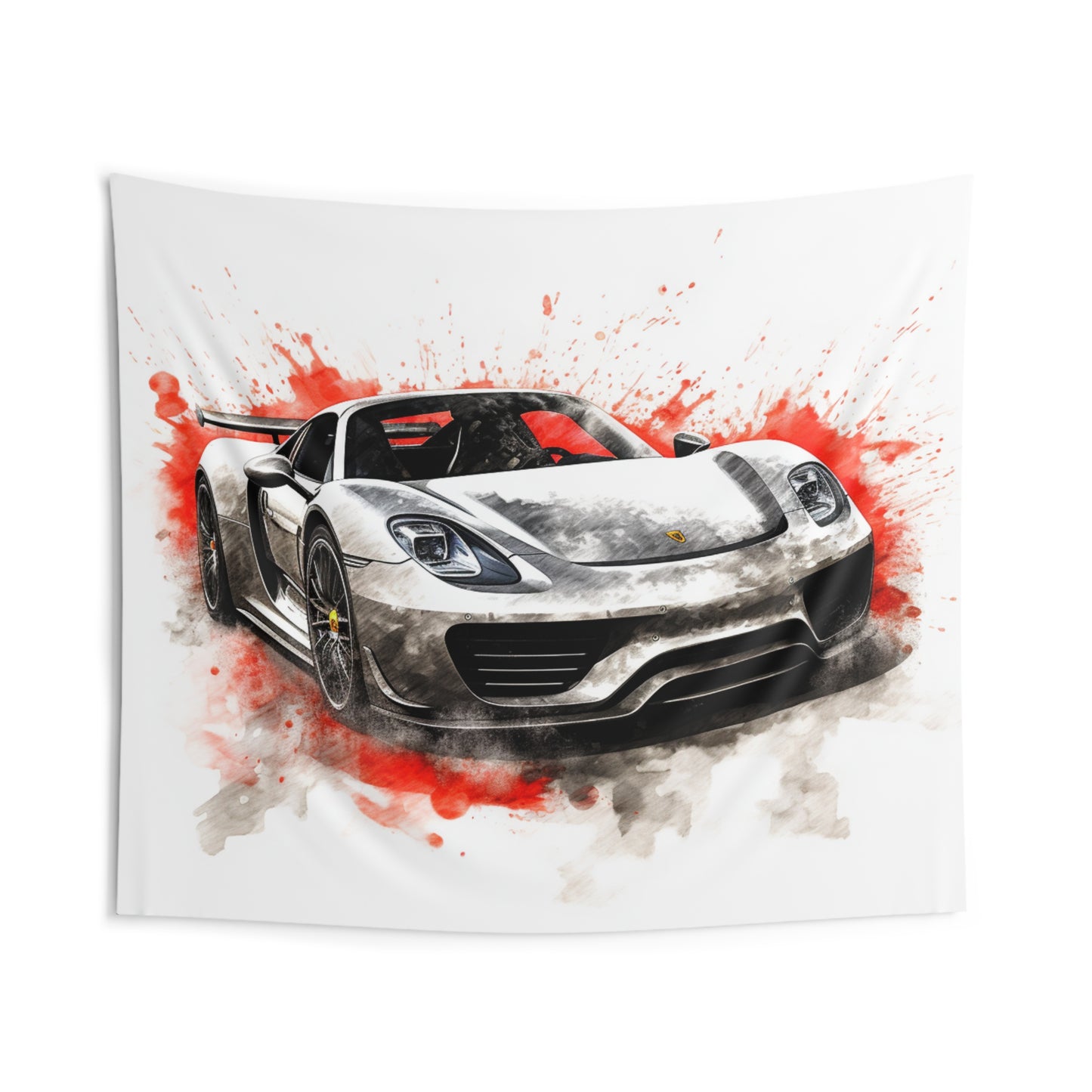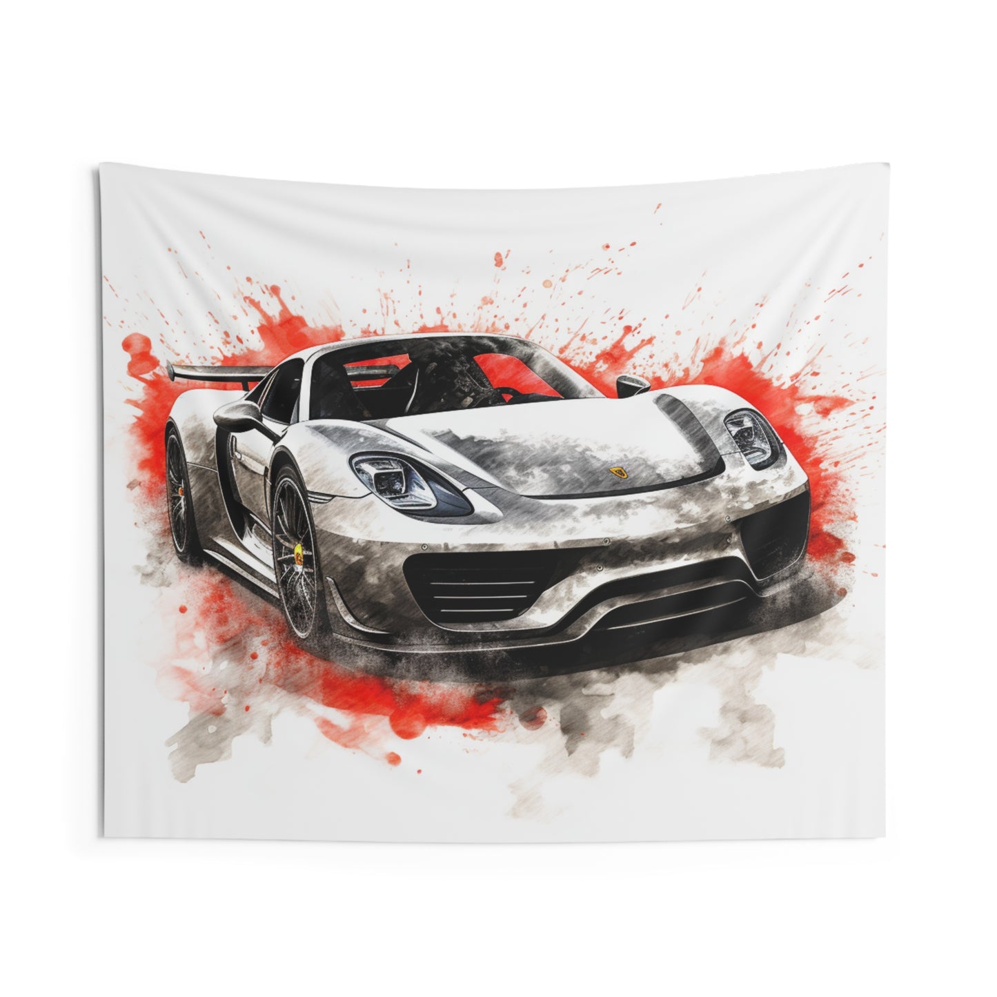 This 918 Spyder Indoor Wall Tapestry features a white background with a 918 Spyder driving fast along the shoreline. Water splashing 4 adds an extra element of artful beauty. It's an ideal addition to any room or décor and is sure to impress all who see it. #911spyder #interiordesign #tapestry #918 #indoor #wallart #drivingsplash #watersplash #whitebackground #tapistry #waterart #speed
