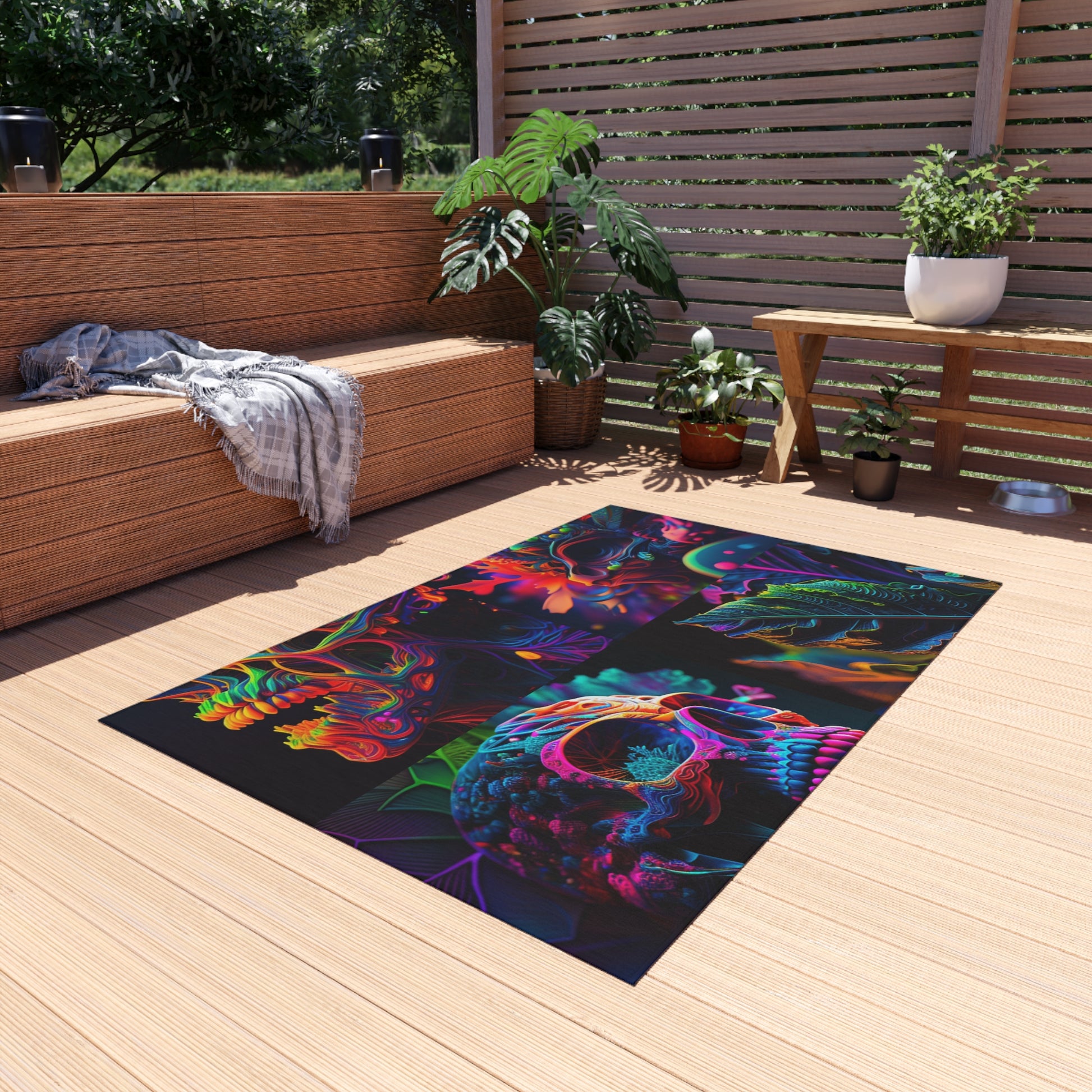 This Fearless Florescent Skull Death 5 Outdoor Rug is the perfect pick for your outdoor patio or garden. This rug is bold and bright with a fun and vibrant colored skull to create an eye-catching addition to your outside decor. Made for all weathers, this rug will stay looking fresh and vibrant through any season. Add a stylish and unique punch to your outdoor space with this one-of-a-kind rug today! #outdoorrug #skullrug #florescent #kickazz #death5 #brightvibes #styleupyourspace #patiodecor #outdoorslapo #durablerug #durableoutdoors #fearlessskull #fearlesslyflorescent #skulleverywhere #luxuryrug