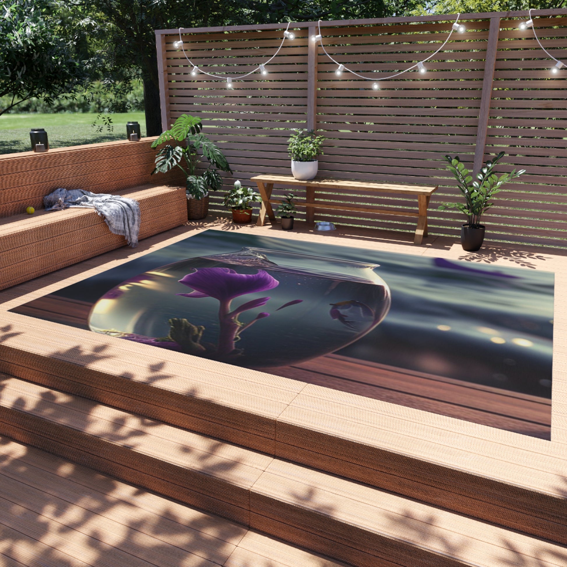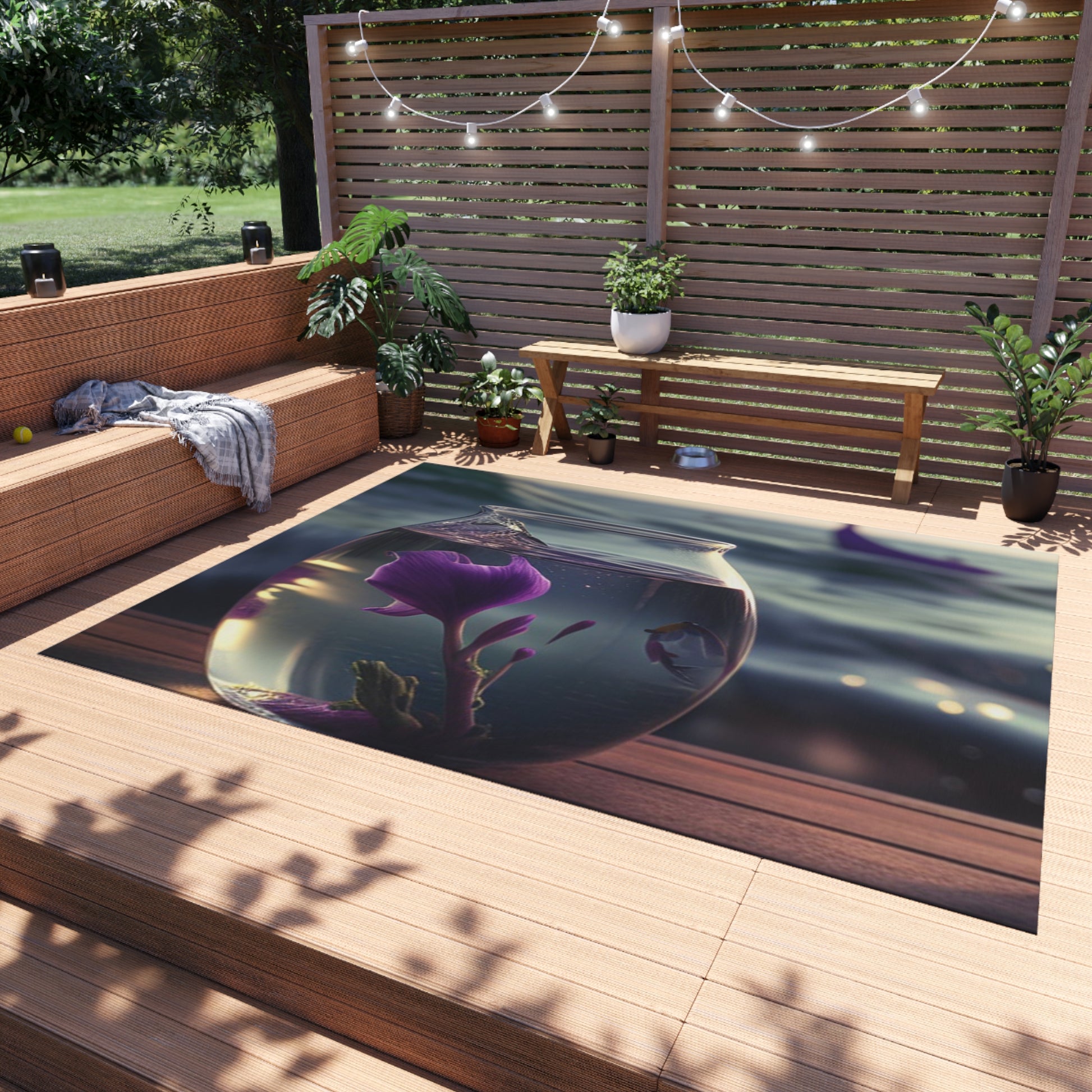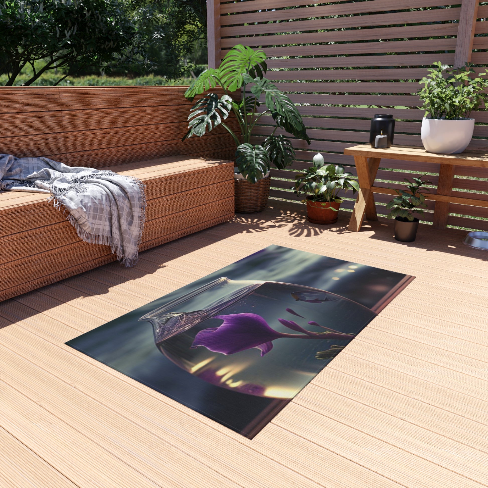This outdoor rug will give any setting an elegant touch! It features a gorgeous design of purple sweet peas in a vase perfect for bringing a natural, floral atmosphere to any deck or patio. It's soft underfoot, durable and easy to clean. #outdoorrug #floral #patiodecor #purplesweetpea #durable #elegant #floraldecor #softunderfoot #vase #flowers #cleaning #patioumbrella