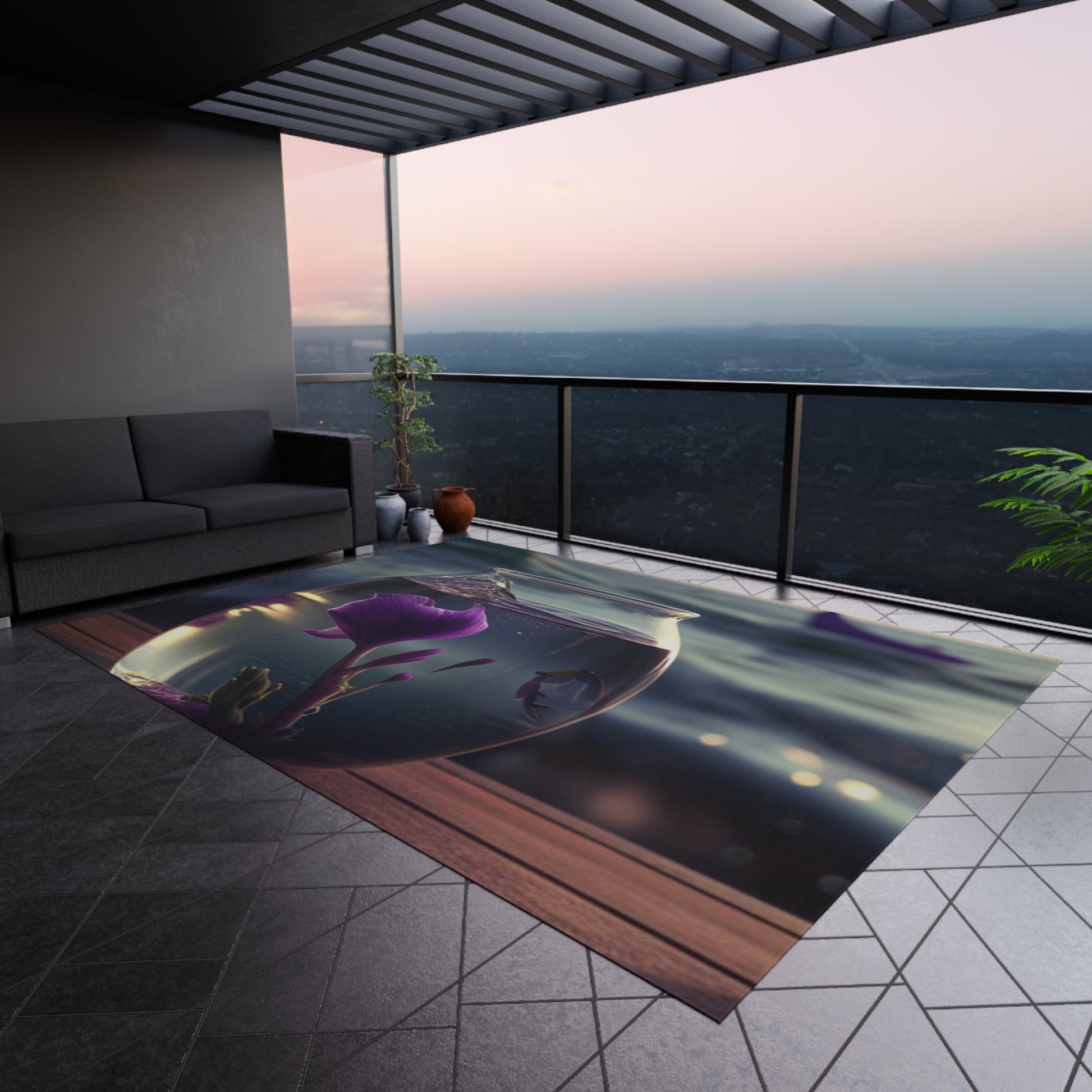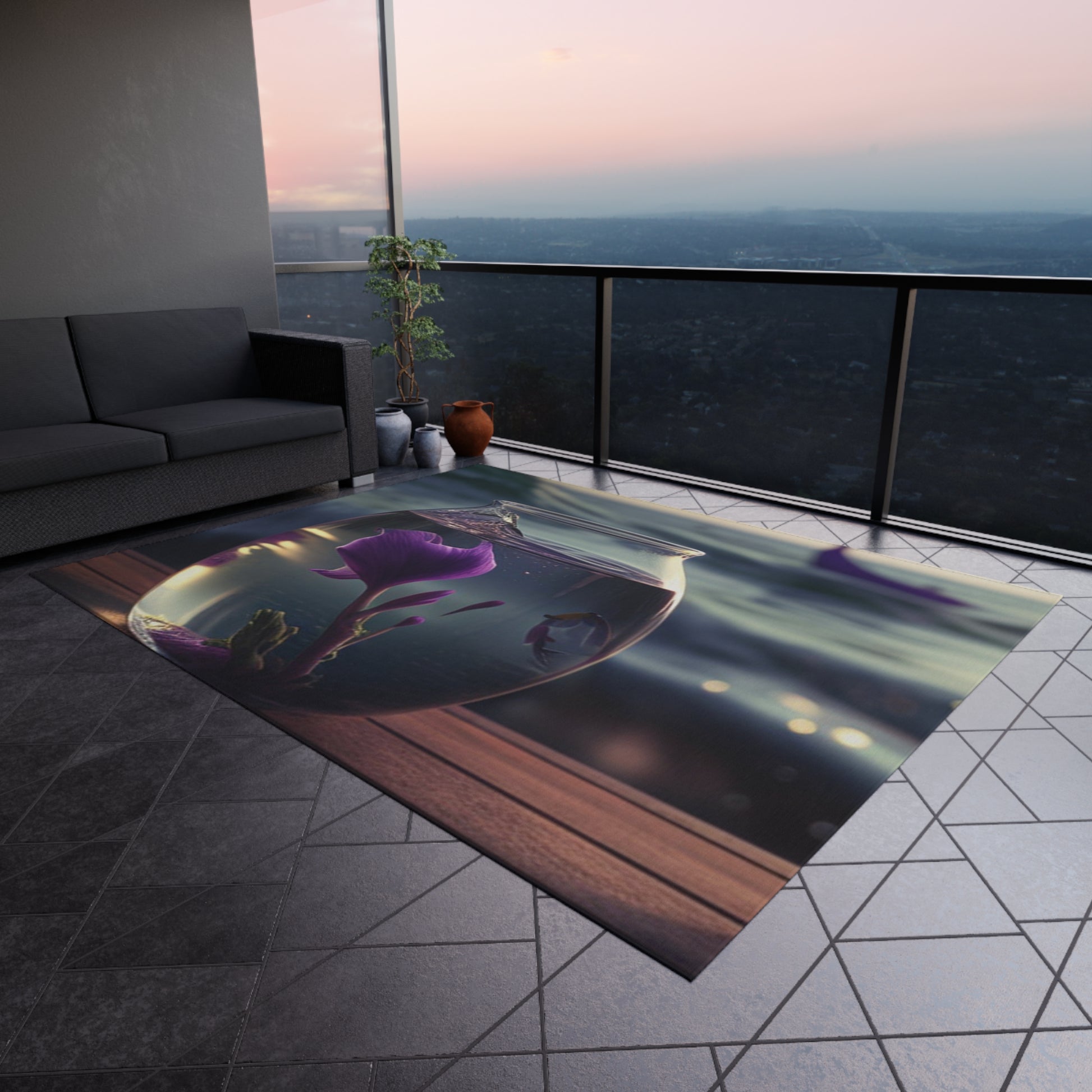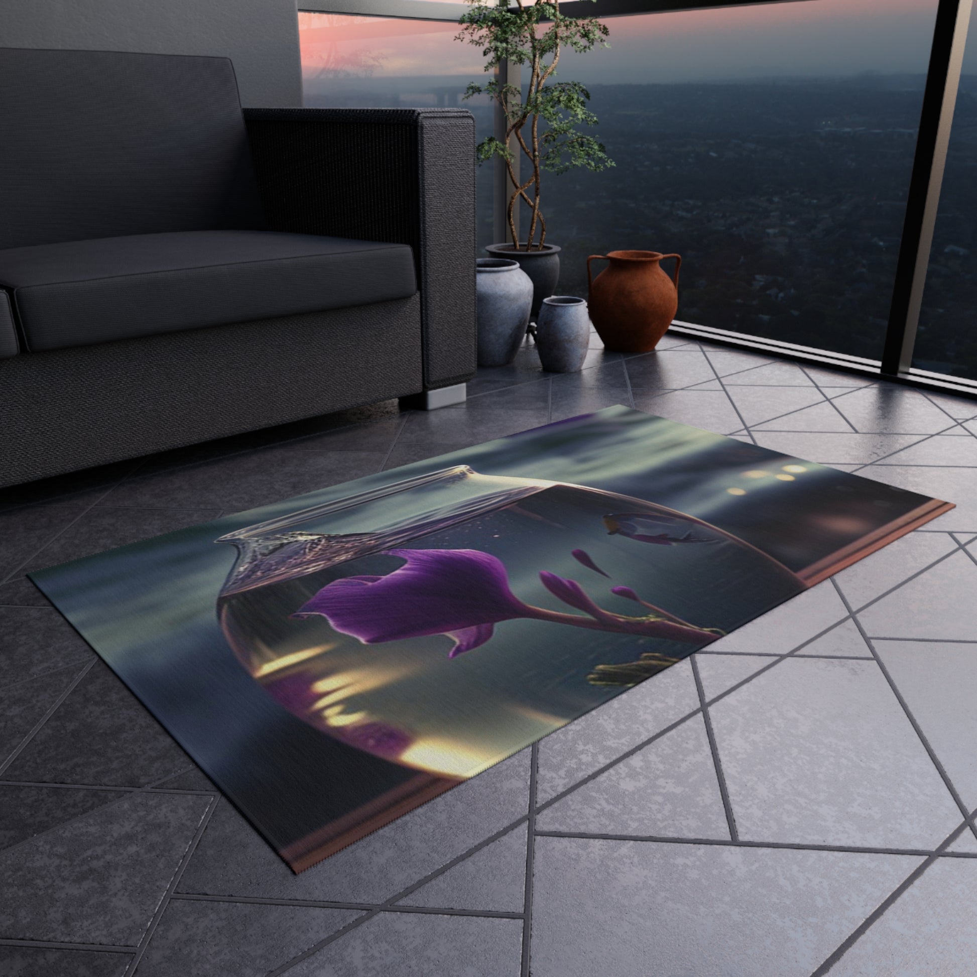 This outdoor rug will give any setting an elegant touch! It features a gorgeous design of purple sweet peas in a vase perfect for bringing a natural, floral atmosphere to any deck or patio. It's soft underfoot, durable and easy to clean. #outdoorrug #floral #patiodecor #purplesweetpea #durable #elegant #floraldecor #softunderfoot #vase #flowers #cleaning #patioumbrella
