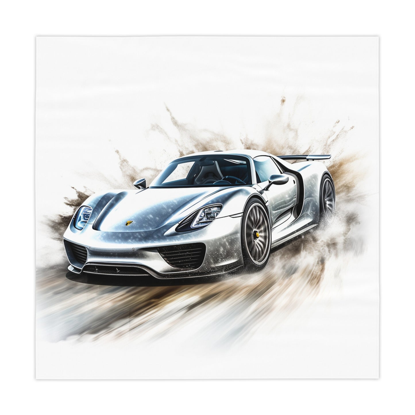 The 918 Spyder Tablecloth features a sleek white background with a stunning Speed blue driver and fluid water splashes. Keep accidental spills and crumbs at bay with this super absorbent cotton and polyester blend. Conquer any dinner party in style with this contemporary twist on classic table linens. #Tablecloth #TableLinen #LuxuryDecor #TableEssentials #HomeDecor #TableDesign #UpscaleTableWear #FineTableDecor #DrivingFast #Spyder #WaterSplashing